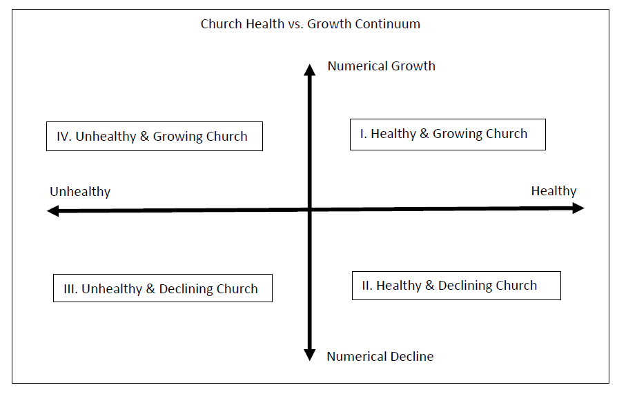 Quadrant IV, Unhealthy and Growing Church – Yes it is possible for an unhealthy church to grow. When they do, their growth will also be unhealthy. . . . An unhealthy church in a booming community could experience some growth. . . . One of the most dangerous of all barriers to church health the perversion of sound doctrine. Many churches that twist doctrine to tickle the itching ear experience growth, but it will be unhealthy growth. . . . The growing church is one that is very much open to spiritual attack, and therefore needs to do a health checkup. . . .